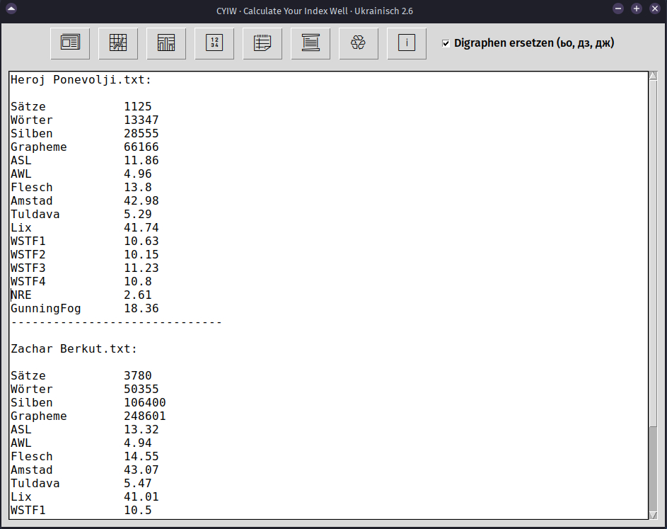 CYIW berechnet wichtige Lesbarkeitsindizes wie Flesch, Amstad, Tuldava, Lix oder den Gunning-Fog-Index und ist derzeit für Russisch, Ukrainisch, Polnisch und Deutsch verfügbar. Die Programme für Ukrainisch und Russisch sind bereits gründlich durchgetestet worden und sollten verlässliche Ergebnisse liefern. Weitere Sprachen sind in Planung.