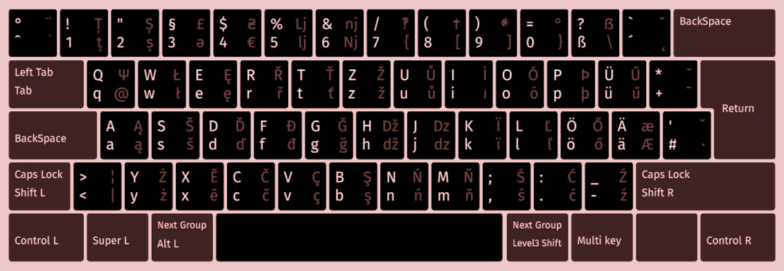 Tastaturlayout für Slawist:innen auf Basis der deutschen QWERTZ-Tastatur. Für Linux. Man kann damit alle slawischen Sprachen, die die Lateinschrift verwenden, sowie Deutsch, Ungarisch, Türkisch und Rumänisch schreiben, ohne das Layout zu wechseln.