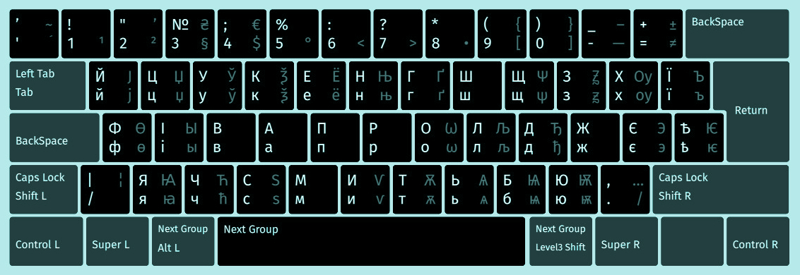 Ukrainisches Tastaturlayout mit belarusischen, russischen, serbischen und altkyrillischen Buchstaben. Für Linux.